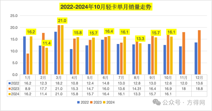 2024年10月,轻卡市场单月16.1万辆,同比下降1.57%,可以看出2024年一季度,轻卡市场呈现V字走势,二季度则平稳增长,平均销量高于去年同期。自8月起,轻卡市场开始走下坡路,8-10月销量同比均负增长,走势向下,降幅连月扩大。
