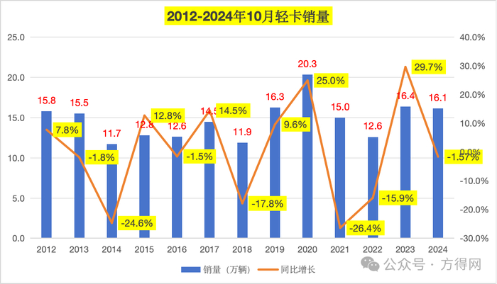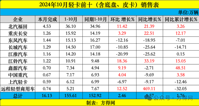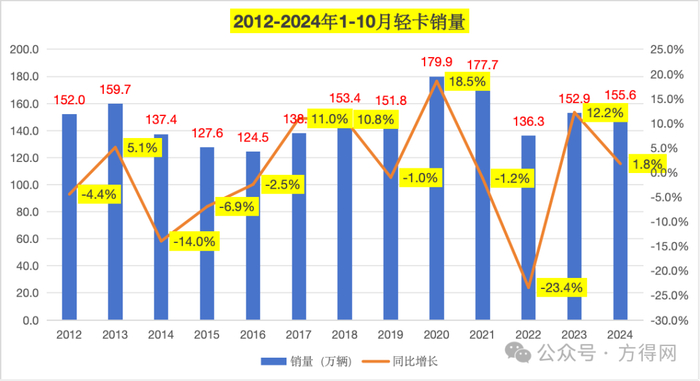 2024年10月,轻卡市场没搭上最后一季度的“东风”,虽环比微增2.46%,但同比下滑。据数据显示,2024年10月,轻卡市场同比降幅1.57%。1-10月累计增长1.76%,2024年底能否超过去年销量?