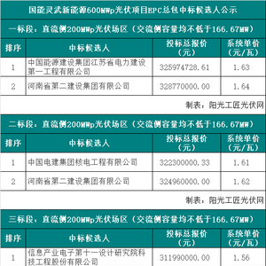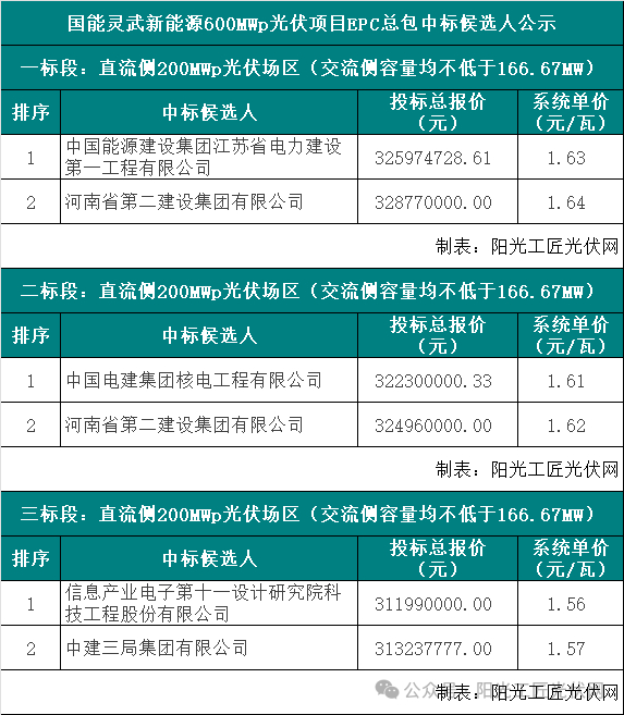 其中标段一,中国能源建设集团江苏省电力建设第一工程有限公司以1.63元/瓦位列第一候选人;