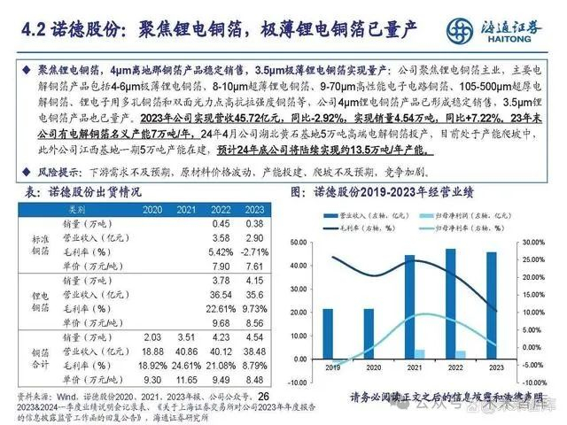 聚焦锂电铜箔,4μm离地那铜箔产品稳定销售,3.5μm极薄锂电铜箔实现量产:公司聚焦锂电铜箔主业,主要电 解铜箔产品包括4-6μm极薄锂电铜箔、8-10μm超薄锂电铜箔、9-70μm高性能电子电路铜箔、105-500μm超厚电 解铜箔、锂电子用多孔铜箔和双面光力点高抗拉强度铜箔等,公司4μm锂电铜箔产品已形成稳定销售,3.5μm锂 电铜箔产品也已量产。2023年公司实现营收45.72亿元,同比-2.92%,实现销量4.54万吨,同比+7.22%。23年末 公司有电解铜箔名义产能7万吨/年,24年4月公司湖北黄石基地5万吨高端电解铜箔投产,目前处于产能爬坡中, 此外公司江西基地一期5万吨产能在建,预计24年底公司将陆续实现约13.5万吨/年产能。