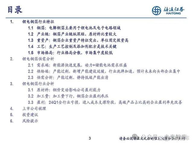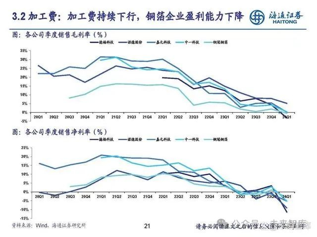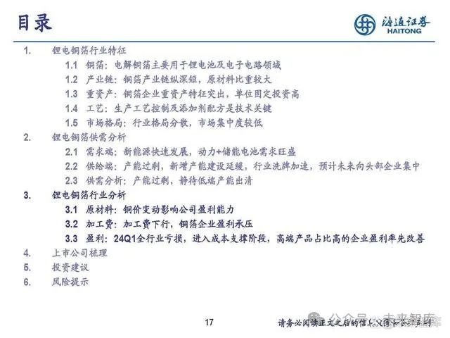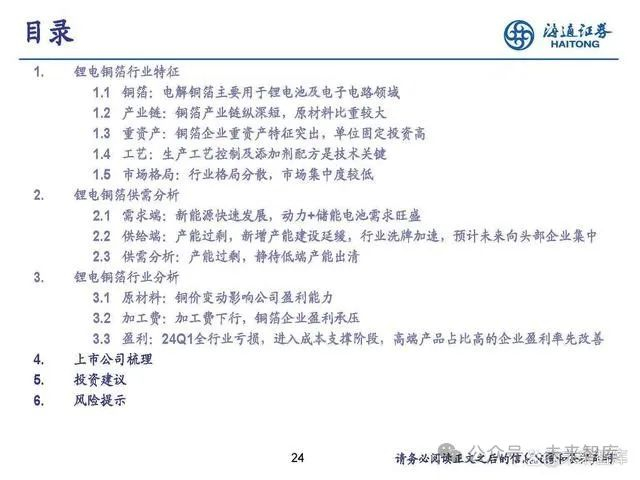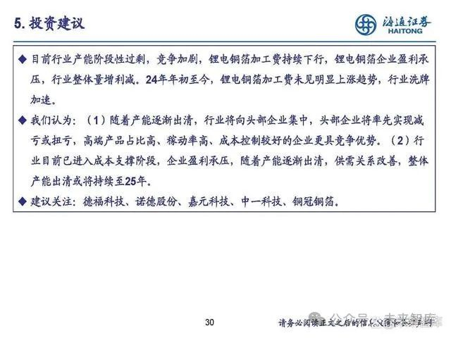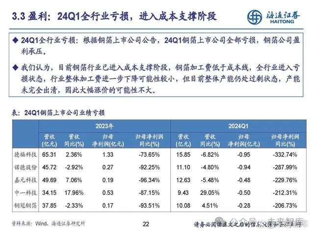 锂电铜箔上市公司24Q1均处于亏损状态,行业全面亏损,非上市公司资金压力更大,加工费更低,行业 整体量增利减,目前行业处在成本支撑阶段。24年年初至今,锂电铜箔加工费未见明显上涨趋势,洗牌加 速,产能逐渐出清,我们预计行业出清或将持续一段时间,行业出现企业收并购潮将是产能开始出清的信 号,头部企业将率先实现减亏或扭亏,高端产品占比高、稼动率高、成本控制较好的企业更具竞争优势。