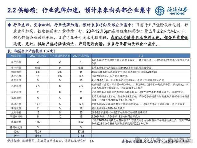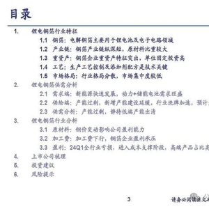 行业底部,竞争加剧,行业洗牌加速,预计未来将向头部企业集中:目前行业产能阶段性过剩,行 业竞争加剧,锂电铜箔加工费持续下行,23年12月6μm高端锂电铜箔加工费已降至2万元/吨以下, 锂电铜箔企业盈利承压,目前行业处于成本支撑阶段,我们认为随着行业洗牌加速,部分产能建设 延缓,无效、低端产能将陆续淘汰,产能逐渐出清,未来行业将向头部企业集中。