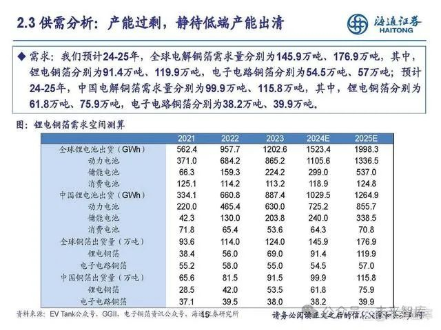 需求:我们预计24-25年,全球电解铜箔需求量分别为145.9万吨、176.9万吨,其中, 锂电铜箔分别为91.4万吨、119.9万吨,电子电路铜箔分别为54.5万吨、57万吨;预计 24-25年,中国电解铜箔需求量分别为99.9万吨、115.8万吨,其中,锂电铜箔分别为 61.8万吨、75.9万吨,电子电路铜箔分别为38.2万吨、39.9万吨。