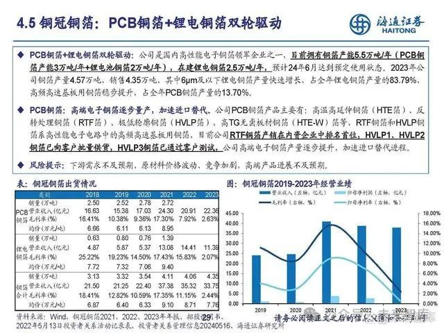 PCB铜箔+锂电铜箔双轮驱动:公司是国内高性能电子铜箔领军企业之一,目前拥有铜箔产能5.5万吨/年(PCB铜 箔产能3万吨/年+锂电池铜箔2万吨/年),在建锂电铜箔2.5万吨/年,预计24年6月达到预定使用状态。2023年公 司铜箔产量4.57万吨,销售4.35万吨,其中6μm及以下锂电铜箔产量快速增长,占全年锂电铜箔产量的83.79%, 高频高速基板用铜箔稳步提升,占全年PCB铜箔产量的13.70%。