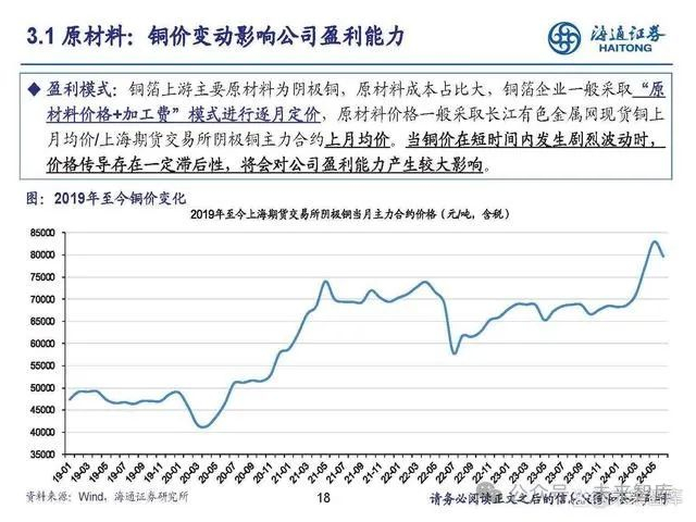 盈利模式:铜箔上游主要原材料为阴极铜,原材料成本占比大,铜箔企业一般采取“原 材料价格+加工费”模式进行逐月定价,原材料价格一般采取长江有色金属网现货铜上 月均价/上海期货交易所阴极铜主力合约上月均价。当铜价在短时间内发生剧烈波动时, 价格传导存在一定滞后性,将会对公司盈利能力产生较大影响。