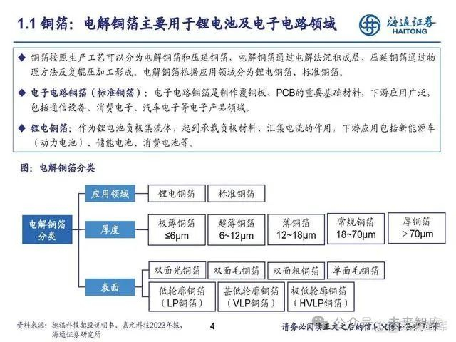 铜箔按照生产工艺可以分为电解铜箔和压延铜箔,电解铜箔通过电解法沉积成层,压延铜箔通过物 理方法反复辊压加工形成。电解铜箔根据应用领域分为锂电铜箔、标准铜箔。 电子电路铜箔(标准铜箔):电子电路铜箔是制作覆铜板、PCB的重要基础材料,下游应用广泛, 包括通信设备、消费电子、汽车电子等电子产品领域。 锂电铜箔:作为锂电池负极集流体,起到承载负极材料、汇集电流的作用,下游应用包括新能源车 (动力电池)、储能电池、消费电池等。