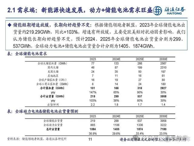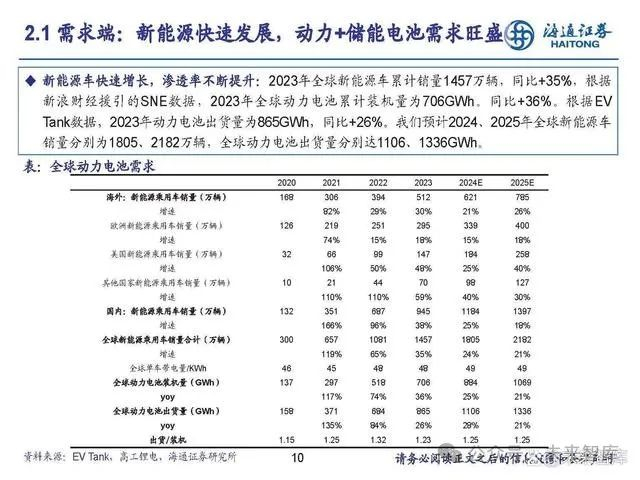 新能源车快速增长,渗透率不断提升:2023年全球新能源车累计销量1457万辆,同比+35%,根据 新浪财经援引的SNE数据,2023年全球动力电池累计装机量为706GWh。同比+36%。根据EV Tank数据,2023年动力电池出货量为865GWh,同比+26%。我们预计2024、2025年全球新能源车 销量分别为1805、2182万辆,全球动力电池出货量分别达1106、1336GWh。