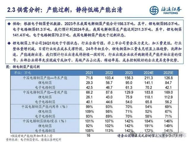 供给:根据电子铜箔资讯数据,2023年末我国电解铜箔产能合计156.3万吨,其中,锂电铜箔95.0万吨, 电子电路铜箔61.3万吨。我们预计到2024年底,我国电解铜箔总产能达到211.3万吨,其中,锂电铜箔 141.4万吨,电子电路铜箔70.2万吨,我国电解铜箔产能处于过剩状态。