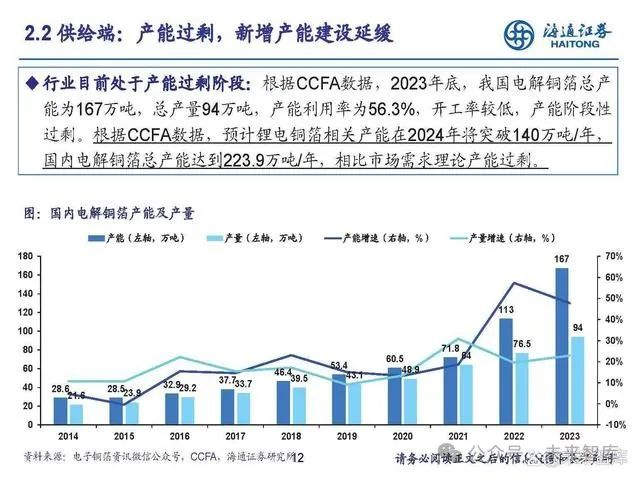 行业目前处于产能过剩阶段:根据CCFA数据,2023年底,我国电解铜箔总产 能为167万吨,总产量94万吨,产能利用率为56.3%,开工率较低,产能阶段性 过剩。根据CCFA数据,预计锂电铜箔相关产能在2024年将突破140万吨/年, 国内电解铜箔总产能达到223.9万吨/年,相比市场需求理论产能过剩。