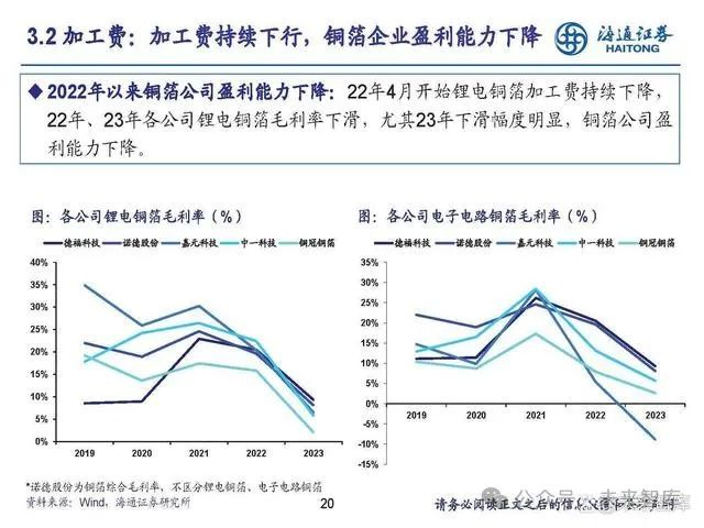 2022年以来铜箔公司盈利能力下降:22年4月开始锂电铜箔加工费持续下降, 22年、23年各公司锂电铜箔毛利率下滑,尤其23年下滑幅度明显,铜箔公司盈 利能力下降。