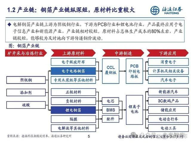 电解铜箔产业链上游为阴极铜行业,下游为PCB行业和锂电池行业,产品最终应用于电 子信息产业和新能源产业,产业链相对较短。原材料占总体生产成本的80%左右,产业 链较短,能够较为及时地向下游传递铜价波动。