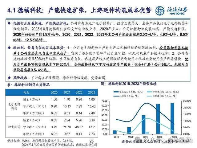 把握行业发展机遇,产能快速扩张:公司前身为九江电子材料厂,经营历史悠久,主要产品包括电子电路铜箔和 锂电铜箔,2023年8月德福科技在深交所创业板上市。2020年至今,公司把握行业发展机遇,产能快速扩张, 2020年初公司产能1.8万吨/年,2020、2021、2022、2023年末公司产能分别达到3.0万吨/年、4.9万吨/年、8.5万 吨/年、12.5万吨/年。