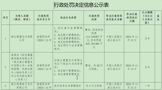 中国人民银行浙江省分行11月20日在官网公布的行政处罚信息公示,浙江商盟支付有限公司(简称“商盟支付”)因违反备付金管理、账户管理、清算管理、机构管理、预付卡业务管理等多项规定,被处以警告、没收违法所得以及罚款两项处罚,合计罚没金额将近540万元。