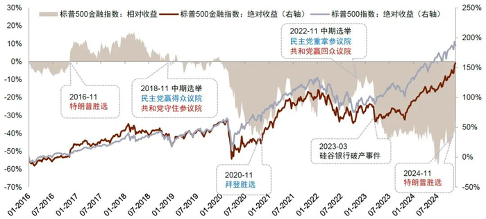 图表1:标普500金融指数绝对&相对收益vs.美国大选等重要事件节点