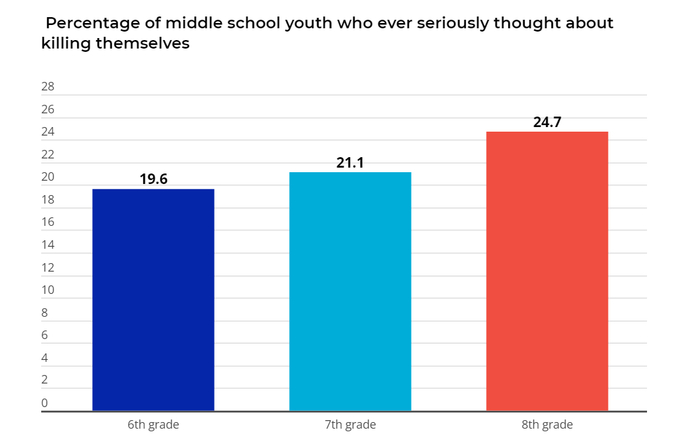 两年前,EducationWeek曾做过一项调研,在中学阶段认真考虑过自杀的学生随着年级越高、比率也上升。