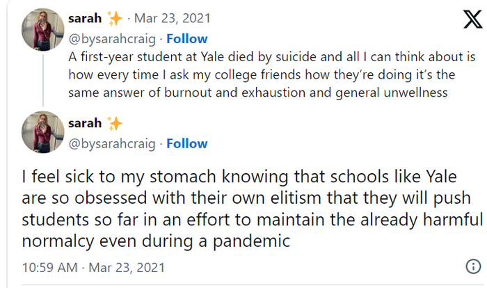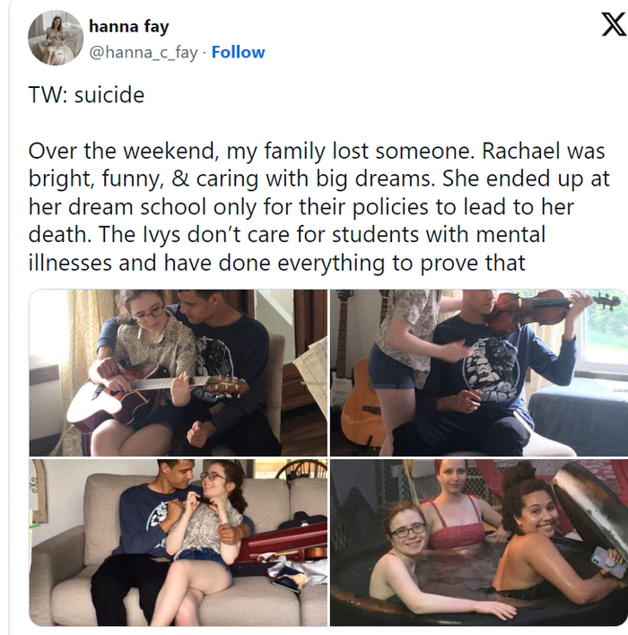 18岁的耶鲁大学新生Rachael Shaw-Rosenbaum自杀身亡后,她的朋友在社交平台就抱怨了学校对学生精神健康问题关注不足。