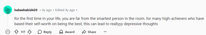 Reddit 上有人发帖问:是什么导致现在顶尖大学的自杀率如此之高?高赞第一的回答是:这是你人生中第一次发现,自己远远不是那里最聪明的人。
