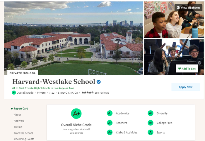 在NICHE上,哈佛西湖是洛杉矶地区排名第一的私立中学,在整个加州464所私立中学里排名第三的学校。从师资、学术到体育等各方面都是A+和A的评分。
