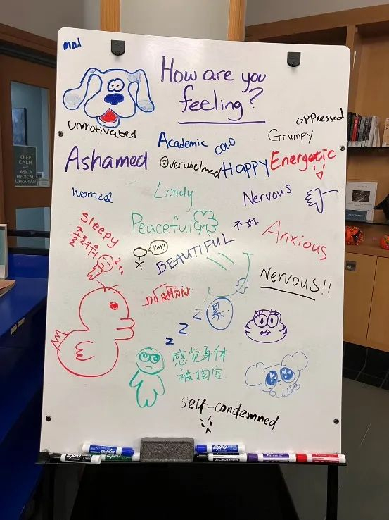 昨天,我路过耶鲁医学院的图书馆,馆内放置了一个白板,询问学生们当下的感受,正面情绪屈指可数。