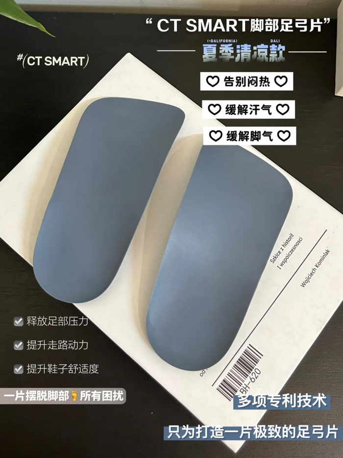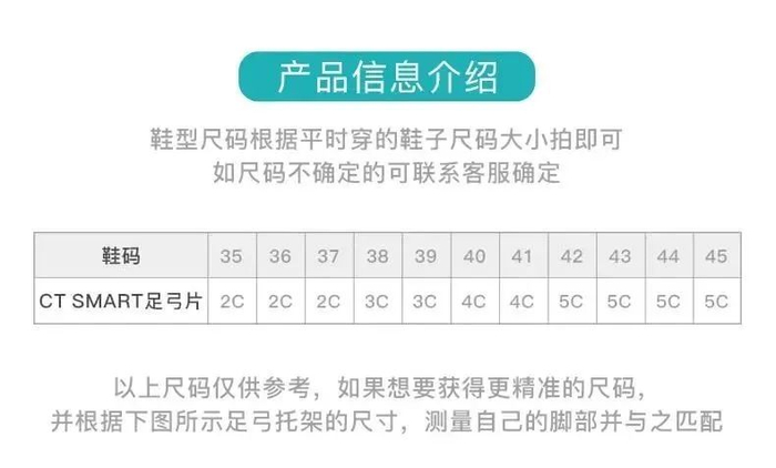 CT-SMART足弓片所使用的是发明专利新技术材料CF碳纤维,不会因为鞋内湿度而变形,超长时间使用,可以帮助足弓辅助回弹。