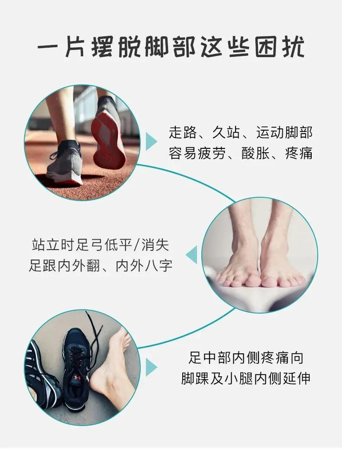 鞋子对脚的支撑不足走路时间长了,足弓的部位会又酸又疼。长年累月穿着,还会增加足弓塌陷的风险,让人患上扁平足。