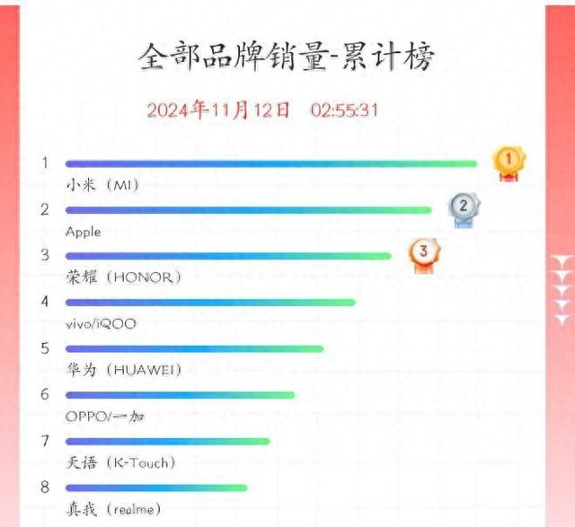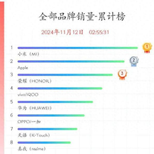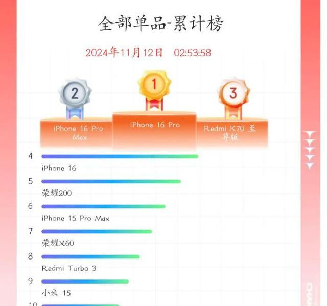 其在降价初期取得天猫“双11”第一阶段3C数码手机排行榜第一。不过,据京东平台发布的 2024 年双 11 手机竞速排行榜显示,今年“双11”期间,小米取代苹果拿下了全部品牌累计销量的冠军;畅销单品上,iPhone 16 Pro和iPhone 16 Pro Max包揽冠亚,iPhone 16则被7月发布的Redmi K70至尊版挤下了前三。