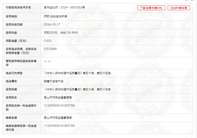 今年10月份,京东集团另一家子公司昆山京东尚信贸易有限公司也因为销售不合格产品被处罚,该公司此前也曾因所售产品不合格被处罚多次。