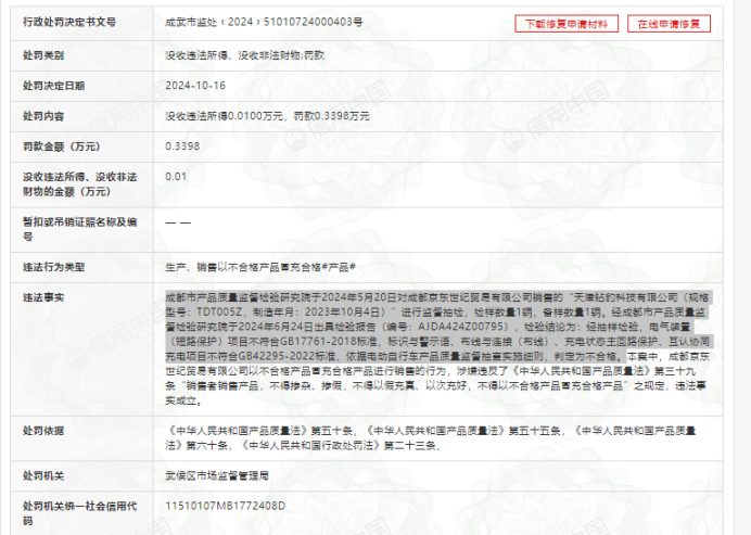 10月16日,成都京东世纪贸易有限公司因销售不合格产品被罚,处罚决定书显示:成都市产品质量监督检验研究院于2024年5月20日对成都京东世纪贸易有限公司销售的“天津钻豹科技有限公司(规格型号:TDT005Z,制造年月:2023年10月4日)”进行监督抽检,检样数量1辆,备样数量1辆。经成都市产品质量监督检验研究院于2024年6月24日出具检验报告(编号:AJDA424Z00795),检验结论为:经抽样检验,电气装置(短路保护)项目不符合GB17761-2018标准,标识与警示语、布线与连接(布线)、充电状态主回路保护、互认协同充电项目不符合GB42295-2022标准,依据电动自行车产品质量监督抽查实施细则,判定为不合格。