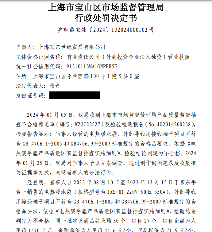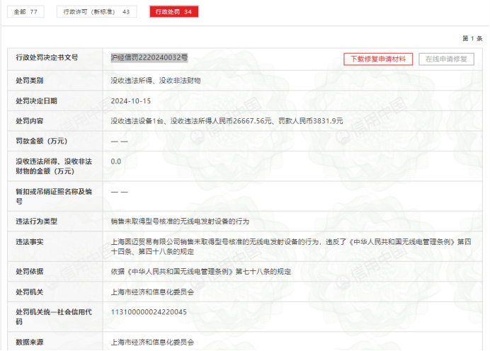 今年10月份,京东集团旗下子公司上海圆迈贸易有限公司因“销售未取得型号核准的无线电发射设备的行为”被上海市经信委处罚(处罚文书号:沪经信罚2220240032号)。