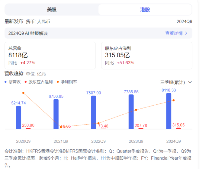 11月14日,京东集团(JD.O;9618.HK)发布了2024年三季报。数据显示,今年三季度,京东集团收入加速增长至2604亿元人民币,归母净利润128.37元人民币。两者同比分别增长5.12%、61.76%;而今年1-9月份,京东的营收整体已经达到8118亿元,股东应占溢利达315.05亿元,后者同比增长了51.63%。