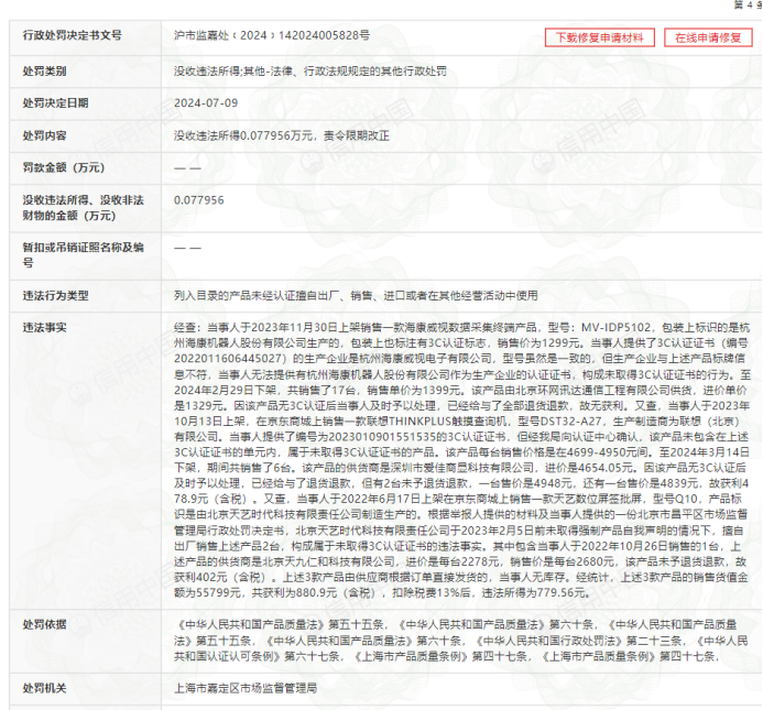 至于上海圆迈贸易公司销售认证证书与产品不符的情形,想要具体了解的读者不妨来看看案例。处罚决定书披露的信息显示:上海圆迈贸易公司于2023年11月30日上架销售一款海康威视数据采集终端产品,型号:MV-IDP5102,包装上标识的是杭州海康机器人股份有限公司生产的,包装上也标注有3C认证标志,销售价为1299元。当事人提供了3C认证证书(编号2022011606445027)的生产企业是杭州海康威视电子有限公司,型号虽然是一致的,但生产企业与上述产品标牌信息不符,当事人无法提供有杭州海康机器人股份有限公司作为生产企业的认证证书,构成未取得3C认证证书的行为。