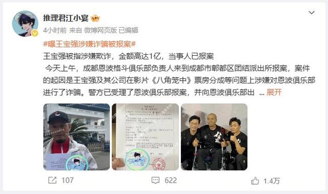 该消息称,21日上午,成都恩波格斗俱乐部负责人去成都郫都区团结派出所报案,指当初与王宝强合作拍电影《八角笼中》时,俱乐部给了王宝强电影全力支持,耗时五年投入的人力物力财力高达百万。俱乐部曾被承诺拿5%的票房分成,后来票房大卖22亿,王宝强却翻脸不认账,对俱乐部不理不睬,至今没有支付任何回报和报酬,导致俱乐部现在经营出现很大问题。该俱乐部认为自己被王宝强及其公司套路了,陷入了一场骗局,被逼无奈报警。