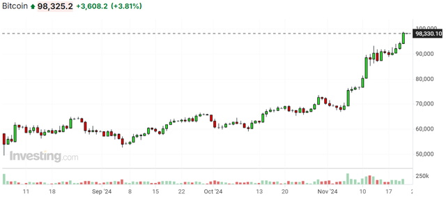 对比来看,当日比特币上涨4.32%,日内高点一度接近10万美元。