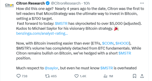 这一发文中还写道,“我很尊重迈克尔·塞勒(Michael Saylor,微策略创始人),但即便是他,也必须知道这家公司过热了。”