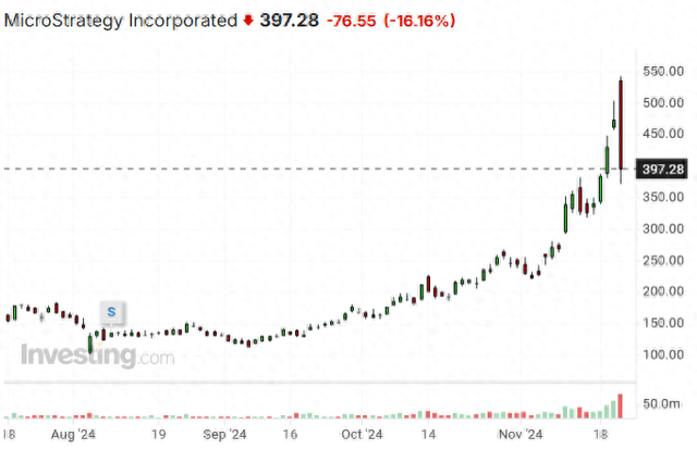 微策略是全球持有比特币最多的上市公司。随着美国大选结果的落定,当选总统唐纳德·特朗普对加密货币的友好政策推动比特币价格攀升,微策略公司的股价理应跟着一同上涨,然而其股价却在周四收跌超过16%,更是一度较日内高点直线俯冲31%。