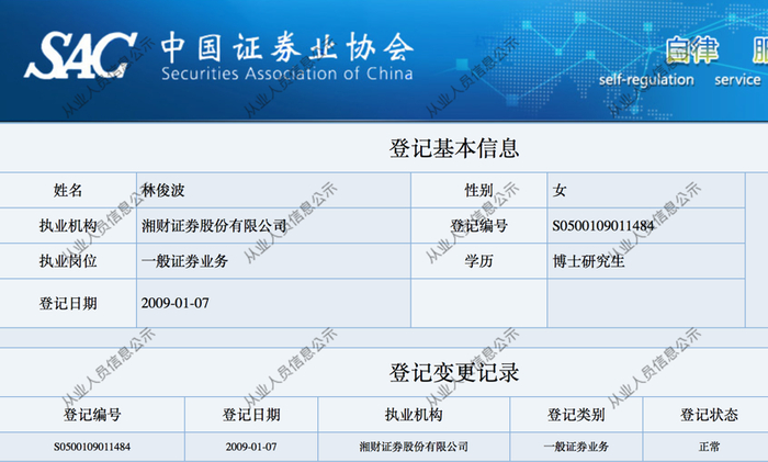 根据湘财证券2017年半年报,彼时举报人林俊波职务为湘财证券董事长,吴勤俭历任总裁助理、财务总监,黄佳平为人事部部长。截至目前,中证协登记信息已查不到吴勤俭的任职信息,但林俊波、黄佳平依旧显示正常履职。