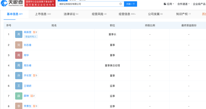 截至目前,湘财证券董事长为高振营,总经理兼董事为周乐峰,刘志雄、周华、许长安为董事;王珺妍、薛琳为监事。