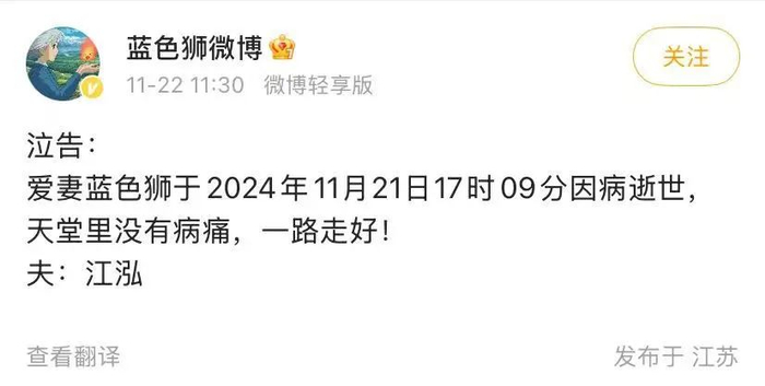 11月22日,蓝色狮丈夫通过蓝色狮个人微博发布泣告:爱妻蓝色狮于2024年11月21日17时09分因病逝世,天堂里没有病痛,一路走好!