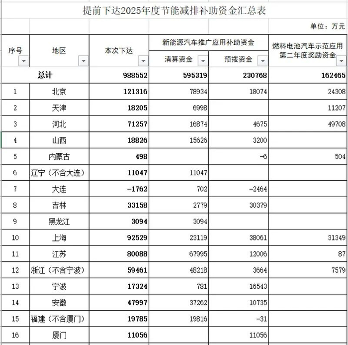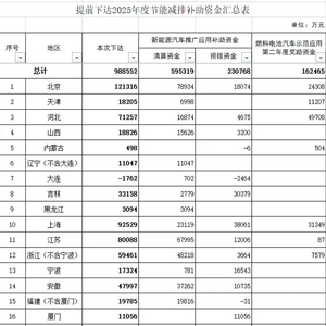 近日,财政部发布了关于提前下达2025年度节能减排补助资金的通知,并公布了详细的资金分配汇总明细。此次补助资金总额超98.85亿元,覆盖了全国多个地区和新能源汽车推广应用、燃料电池汽车示范应用领域。