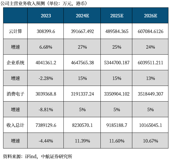 企业系统服务涉及基础建设、人工智能、计算、存储、软件、网络及安全、物联网应用等领域,为科技制造商提供产品推广和解决方案服务。基于在信息技术产业的资源积累和长期实践,全面链接产业上下游,携手合作伙伴为政府、金融、交通、制造、能源、教育、医疗、媒体等行业提供一站式信息化解决方案。公司积极推进信创布局,与华为、浪潮、中科曙光、奇安信等国内主流厂商共创行业新生态。此外,目前算力正成为数字经济增长的新动力,公司加快布局算力领域,打造包括基础设施、云计算、智能平台、解决方案的人工智能产业生态。24H1企业系统业务+24.31%,预期24-26年仍将保持快速增长。