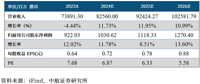我们认为,公司经营稳健,受益于东南亚业务的拓展及信创的铺开,有望实现有质量的增长。预计公司2024-2026年的营业收入分别为825.60亿港元924.24亿港元、1025.82亿港元;归母净利润分别为10.31亿港元、11.18亿港元、12.70亿港元,对应目前PE分别为7X /6X /6X,首次覆盖,给予“买入”评级。