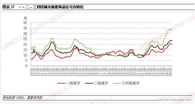 2)历史上,住宅新开工面积增速与70大中城市新房价格增速保持了较高的同步性,也就是说开发商的开工反应与调价行为基本同步。不过,2024年以来,房屋新开工面积同比增速相比2023和2022年两年平均增速呈现出降幅收窄,但新房销售价格跌幅进一步扩大。近年来所拿地块需要加紧开工。据克尔瑞对22城拿地情况的统计,2021年集中供地以来,2021到2023年城投公司参与拿地数量占比达到46%;但城投公司拿地项目开工率仅为25.23%,低于总体开工率24个百分点。而根据土地管理法的规定,开发商在取得《国有土地使用证》后,必须在两年内开始建设,如果超过这一期限未动工,那么地方政府有权无偿收回土地使用权。但由于本次房地产市场调整持续时间较长,市场对房地产周期的预期生变,新房价格未见改观。