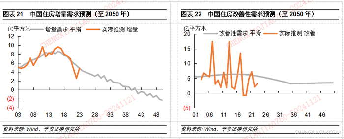 2、 改善性需求。据第七次人口普查数据,2020年末城镇家庭户人均住房建筑面积为38.62平方米,相比2010年第六次人口普查增加8.29平米。然而,人均居住面积的年度数据和普查统计存在样本和精度的差异,且年度数据公布并不完整,我们参考北京市历年人均住房面积的变化补充缺失值,并以二次函数拟合并预测人均居住面积的数值。对应地,人均居住面积改善带来的商品房需求等于上一年城镇人口存量乘以人均居住面积相比上一年提升的数值。以此测算,商品房的改善性需求在2015年前后达到6.4亿平米左右的峰值。在人均居住面积达到一定水平后,边际提升的速度放缓,对应的商品房改善性需求到2023年约降至5.8亿平米。