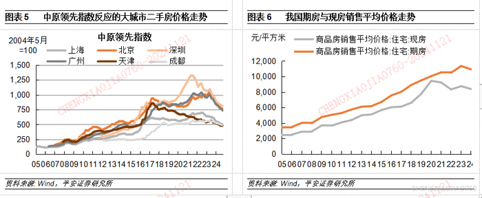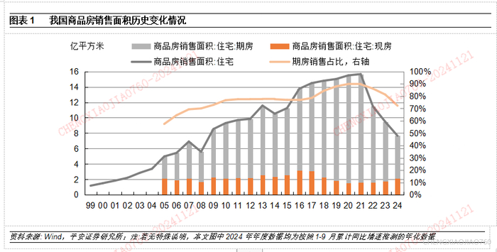 我国房地产销售以期房为主导,2005-2010年,期房销售占比从57.4%上升到76.7%;2017年开始进一步上行,到2020-2021年期房销售占比已近90%。2022年以来,市场转冷情况下购房者对现房偏好增加。2024年前9个月期房销售占比降至72.2%,从现房与期房平均销售价格的差距拉大来看(图表6,前9个月现房与期房价格分别为8384和10921元/平方米),现房销售占比提高在一定程度上可能与此前期房滞销变为现房后降价有关。