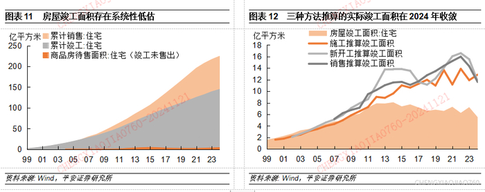 值得一提的是,房屋竣工面积指标或存在系统性低估。1999年以来累计住宅销售面积与累计住宅竣工面积存在巨大裂口,到2024年裂口达到79.9万亿平方米,而这一理论上的竣工未售出住宅库存,与4万亿平方米的“商品房待售面积:住宅”完全不可比。这主要是房地产开发商通过统计报表报送竣工面积的及时性和准确性相对较差,往往是年底统一报送一批且不完整。我们采用三种方法估算实际房屋竣工面积: