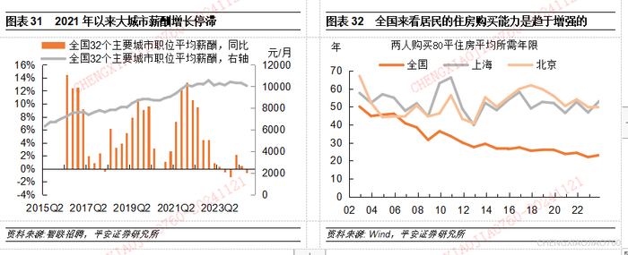 4、 从房价收入比来看,居民购房需以稳定的收入预期为前提,否则也会导致购房需求延迟。我们按照房价收入比=(住宅成交均价*人均住宅建筑面积)/(人均可支配收入*住房公积金修正系数),对中国房价收入比的平均状况进行估算,2023年为7.8倍,也就是购买一套住房相当于一个人约8年的可支配收入。根据诸葛数据研究中心对100个重点城市房价收入比的计算,2023年百城平均房价收入比约为11.5倍,其中一线城市高达28.5倍、二线城市为12.3倍、三四线城市为8.5倍。