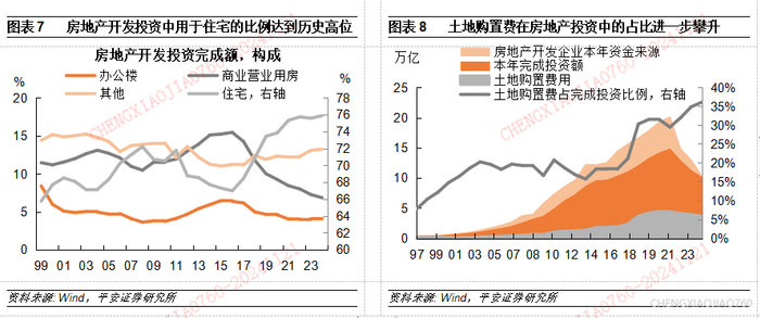 4)近年来房地产投资单位建筑面积所包含的土地成本已超过建筑施工成本。我们采用土地购置费/成交土地规划建筑面积,计算单位建筑面积土地购置成本;采用(本年完成投资额-土地购置费)/房屋施工面积,计算单位施工面积投资额。通过对比土地成本与建筑施工成本观察房地产投资的成本结构,可见2014年以来,房地产开发的土地成本快速上升,从2013年的236元/平方米上升到2024年1309元/平方米;而建筑施工成本震荡走低,从2013年的1090元/平方米降至2024年的874元/平方米。