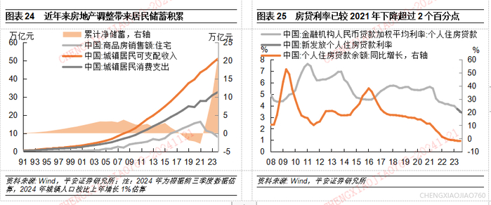 那么,这种调整是否已经充分?如前文分析所反映的:从潜在需求来看,房地产销售已经连续三年低于潜在需求水平,2024年预计比潜在需求低2.7亿平;从购房能力来看,经过三年减少购房,城镇居民储蓄得以积累,此前购买力透支的状况已明显缓解;从购房成本来看,房价跌约15%、首付比例平均降约10-30%、贷款利率较2021年末下降2.23个百分点,购房的近期与远期成本均有明显降低。如此,房地产止跌回稳应该说是具有客观基础的。