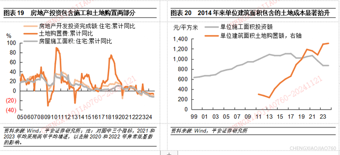 另一方面,土地财政本身也有抬高地价、房价的潜在问题。2018年以来,随着房价、地价上涨,房地产开发投资中的土地购置费占比从此前的19%左右显著攀升,2024年预计将达到36%;单位建筑面积的土地成本也从2020年开始显著超过了建筑施工成本,具有垄断属性的土地成为房地产价格的更重要组成部分。