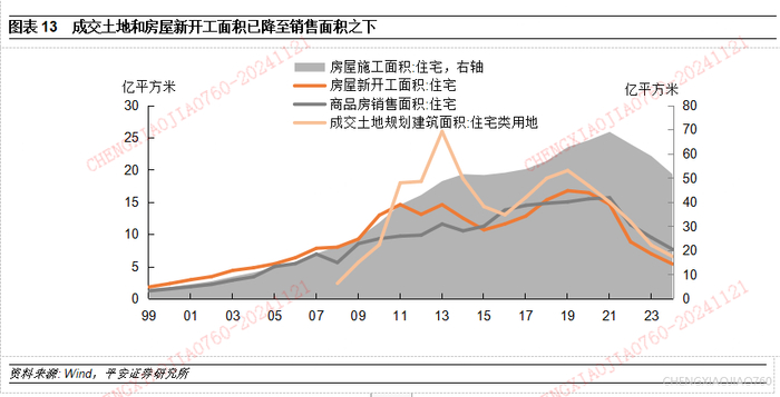 3)历史上,房地产开发投资增速与房屋施工面积增速保持较高的同步性。因为房地产投资本就与房屋施工规模挂钩,另一部分是土地购置费。2010年、2014年、2018-19年土地购置费高速增长,对当期的房地产投资起到支持作用。但土地购置费不计入GDP核算,因此房地产施工更能集中体现房地产行业对经济增长的拉动作用。房屋新开工面积与房地产投资和施工面积增速总体上也是同步的,但新开工面积增速波动幅度更大,相对来说更加灵敏,比如2024年新开工面积降幅收窄,同期房地产投资增速也实现了止跌。